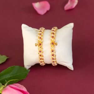 ₹900.00Set of 2 gold-plated bangles. Each has Semi cultured pearls with Pink & green semi precious gems. Secured with screw closure. -