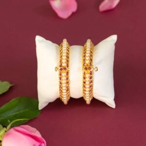 ₹900.00Set of 2 gold-plated bangles. Each has Semi cultured pearls with Pink precious gems. Secured with screw closure. -