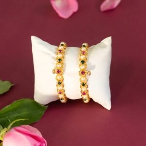₹400.00Set of 2 gold-plated bangles. Each has Semi cultured pearls with Pink & green synthetic gems. -