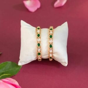 ₹2,350.00Exquisite Kundan bangles featuring an opulent design. Embellished with striking drop-shaped green semi-precious gems. -