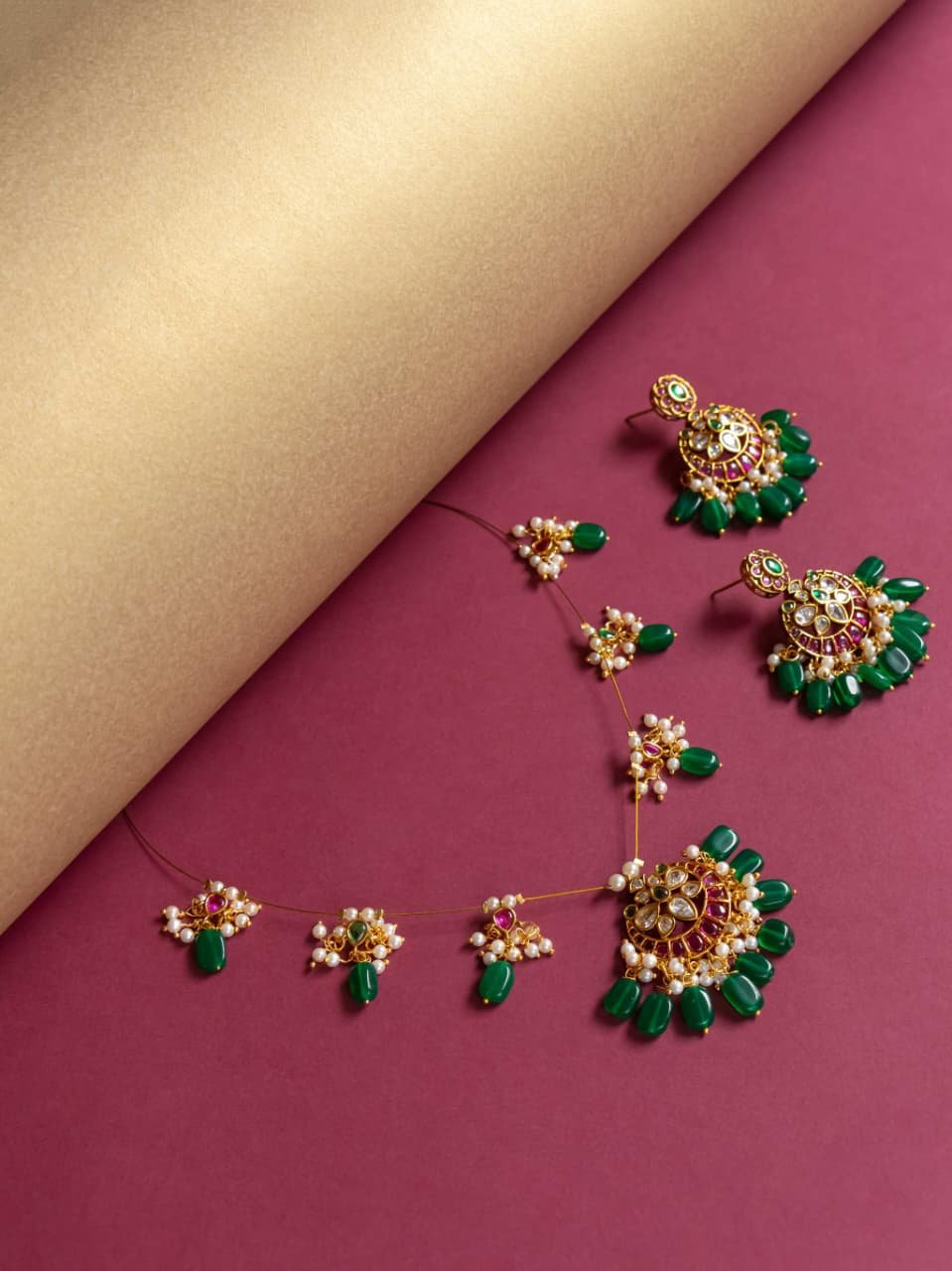 An antique necklace set with drop-shaped designs, featuring semi-cultured pearls and red and white stones with green semi-precious beads.