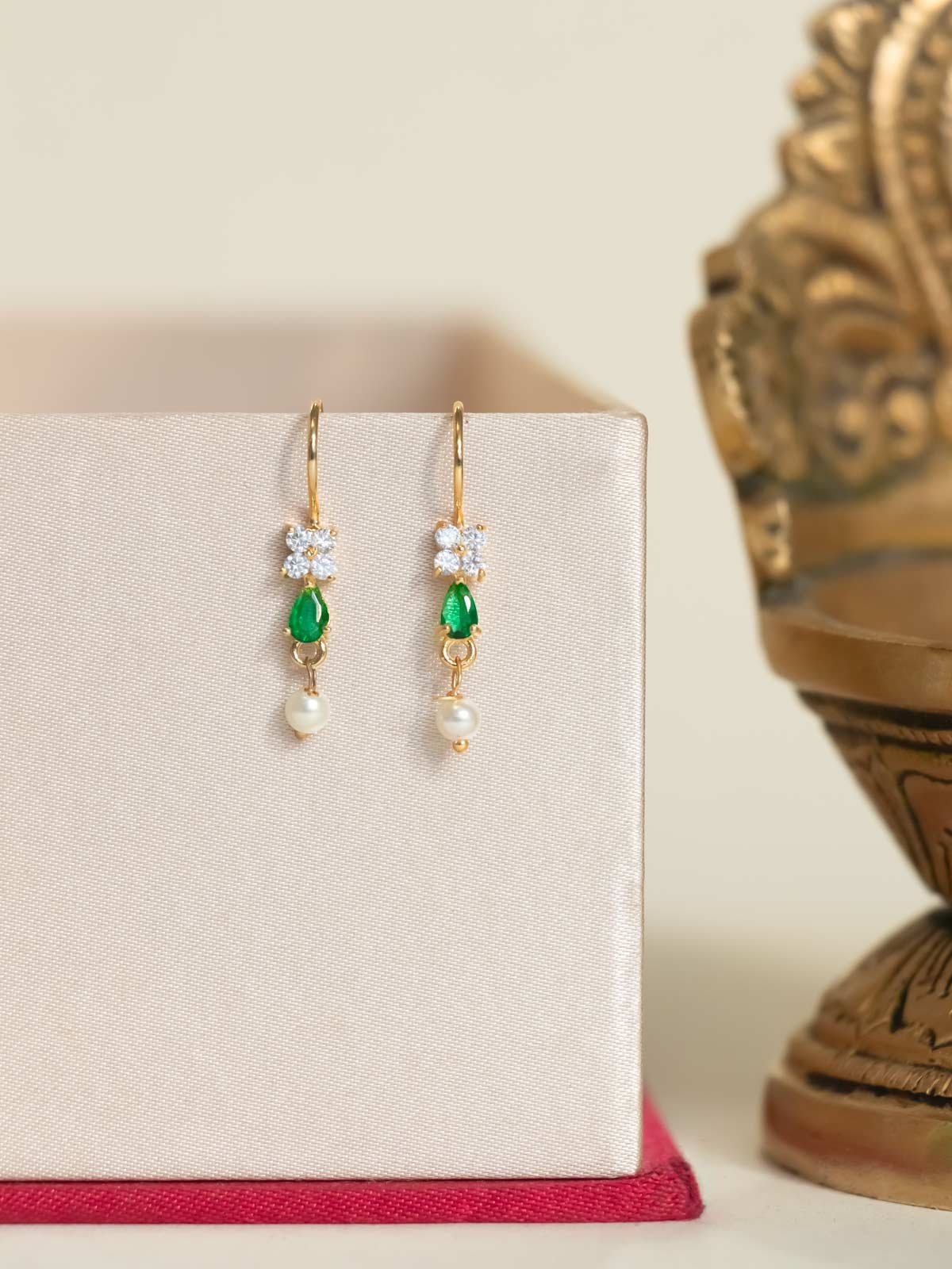 Delicate floral shaped Bugdi earrings showcasing a beautiful green colour semi-precious gem. A charming piece for subtle elegance.