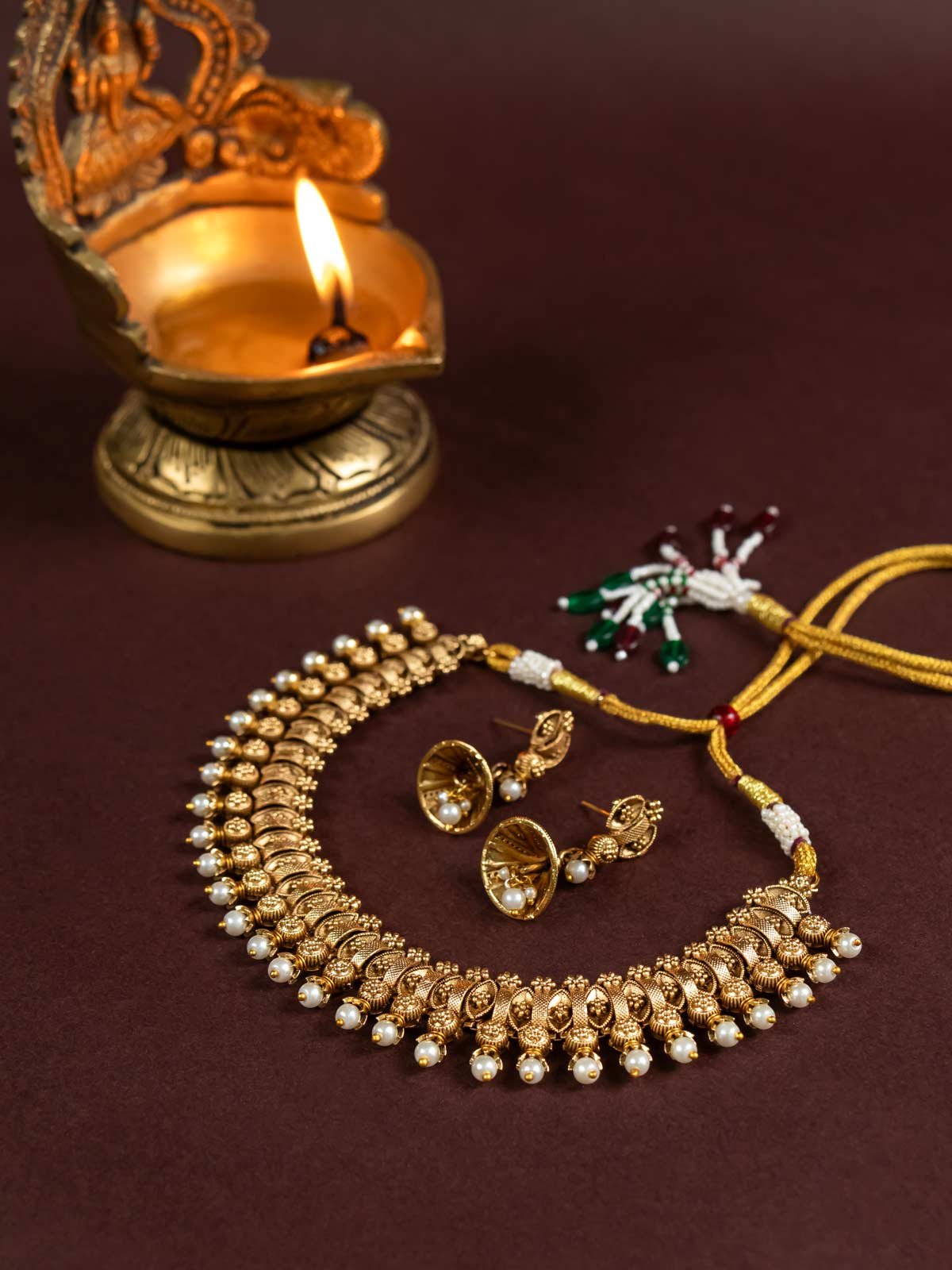 Stunning antique necklace set with golden polish and pearls, perfect for traditional wear.