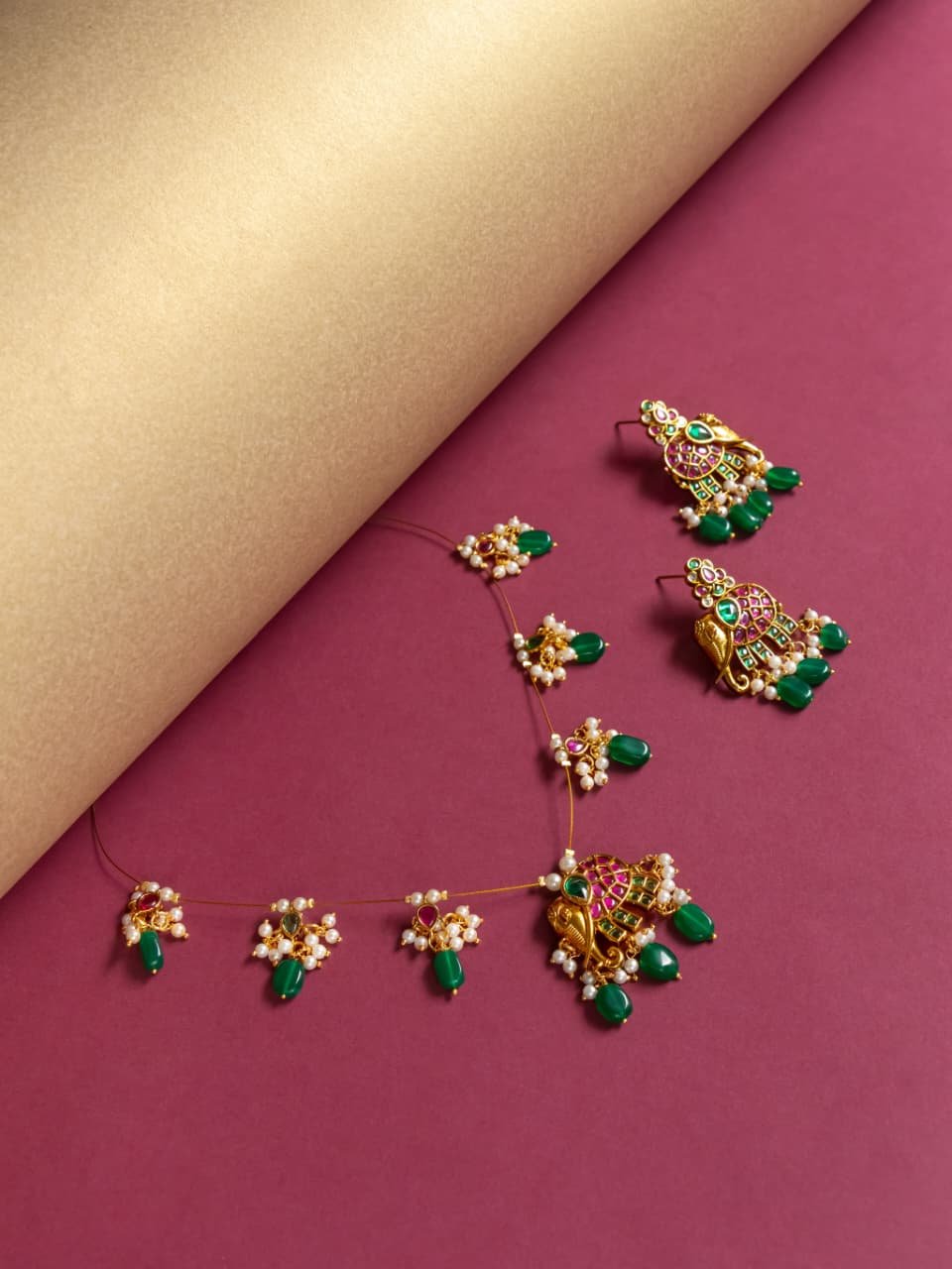 An exquisite antique necklace set with elephant drop designs, adorned with semi-cultured pearls, green beads, and vibrant red and white stones.
