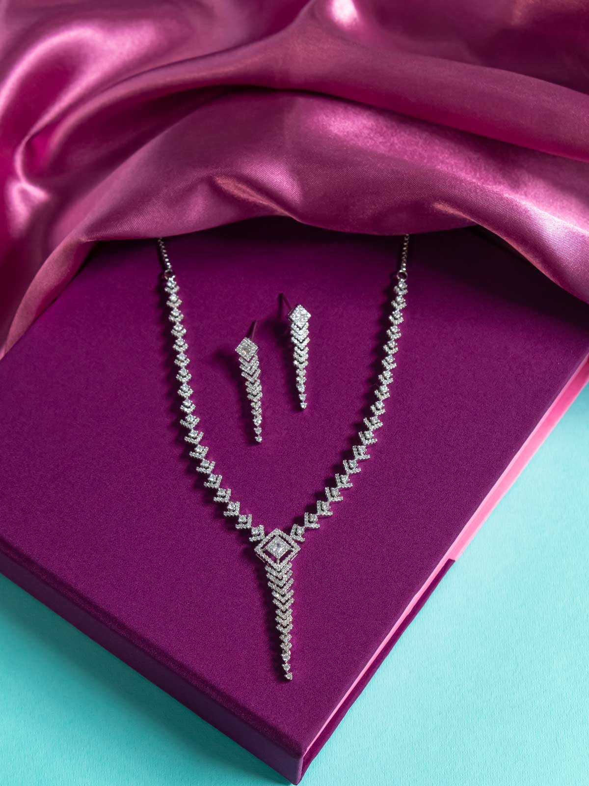 Dainty amrican diamond necklace set with silver polish and an adjustable chain for a perfect fit.