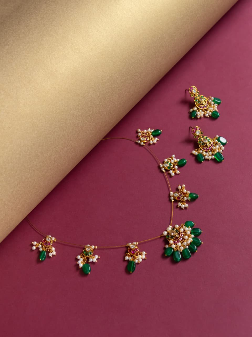 A delicate, antique necklace set with timeless drop-shaped designs, semi-cultured pearls, and vibrant red and white stones with green beads.