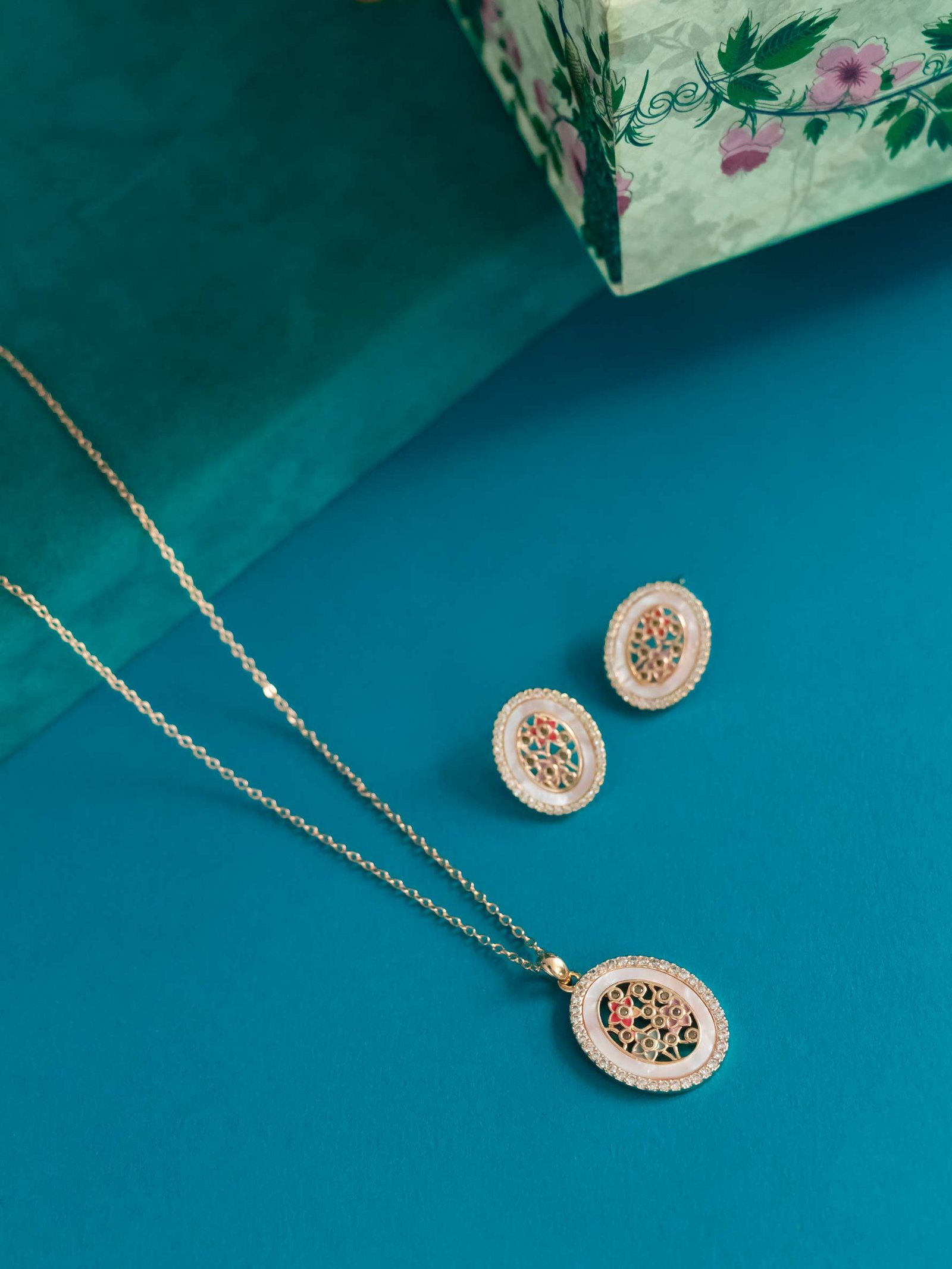 Dazzling rose gold polish chain set featuring American diamond, mother of pearls, and a round design.
