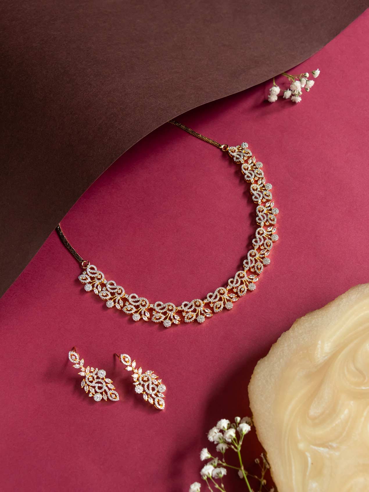 Refined golden-silver dual-tone necklace set featuring a delicate floral design. Sparkling with high-grade American diamonds, it’s the perfect subtle statement for any occasion.