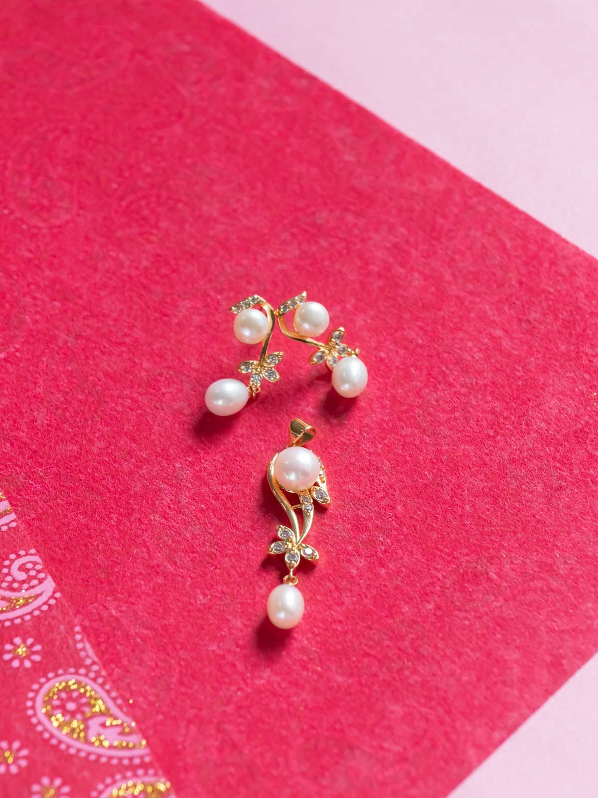 Radiant freshwater pearl pendant set with a luxurious golden polish. Embellished with American diamonds for a high-end, classic look.