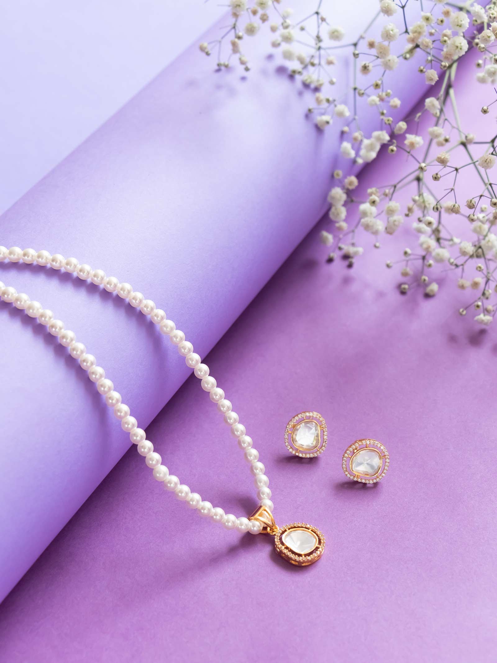Opulent 15-16 inch shell pearl set featuring a central Kundan stone framed by American diamonds. A regal piece that celebrates traditional craftsmanship.