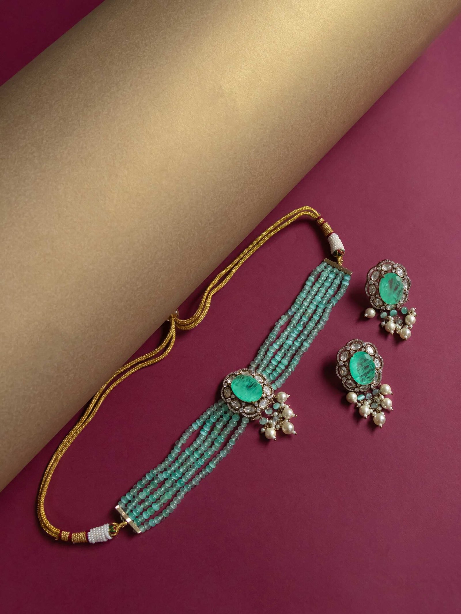 A breathtaking Kundan and American diamond set with a round pendant, pearls, and sea-blue beads.