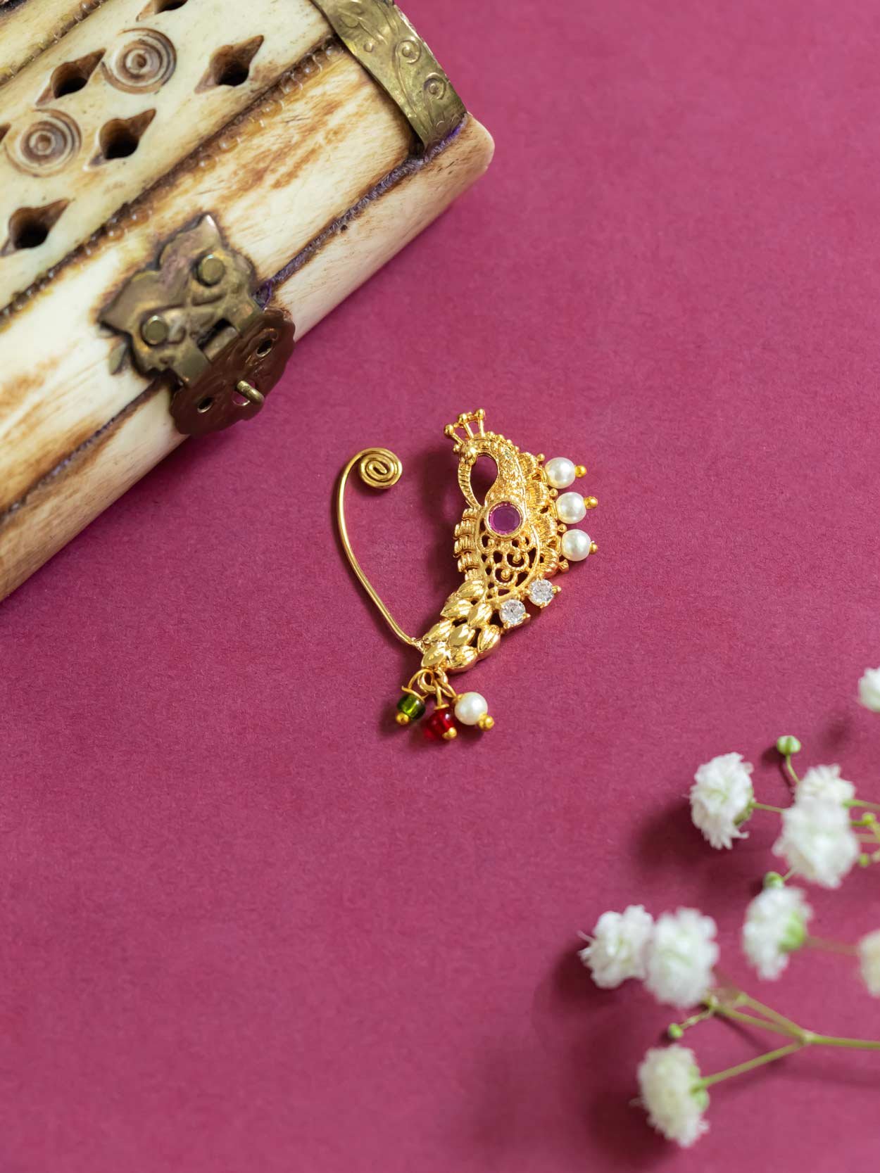 Opulent 3 cm Peacock-shaped Nath in a golden finish with sparkling American diamonds. A showstopping piece for festive wear.