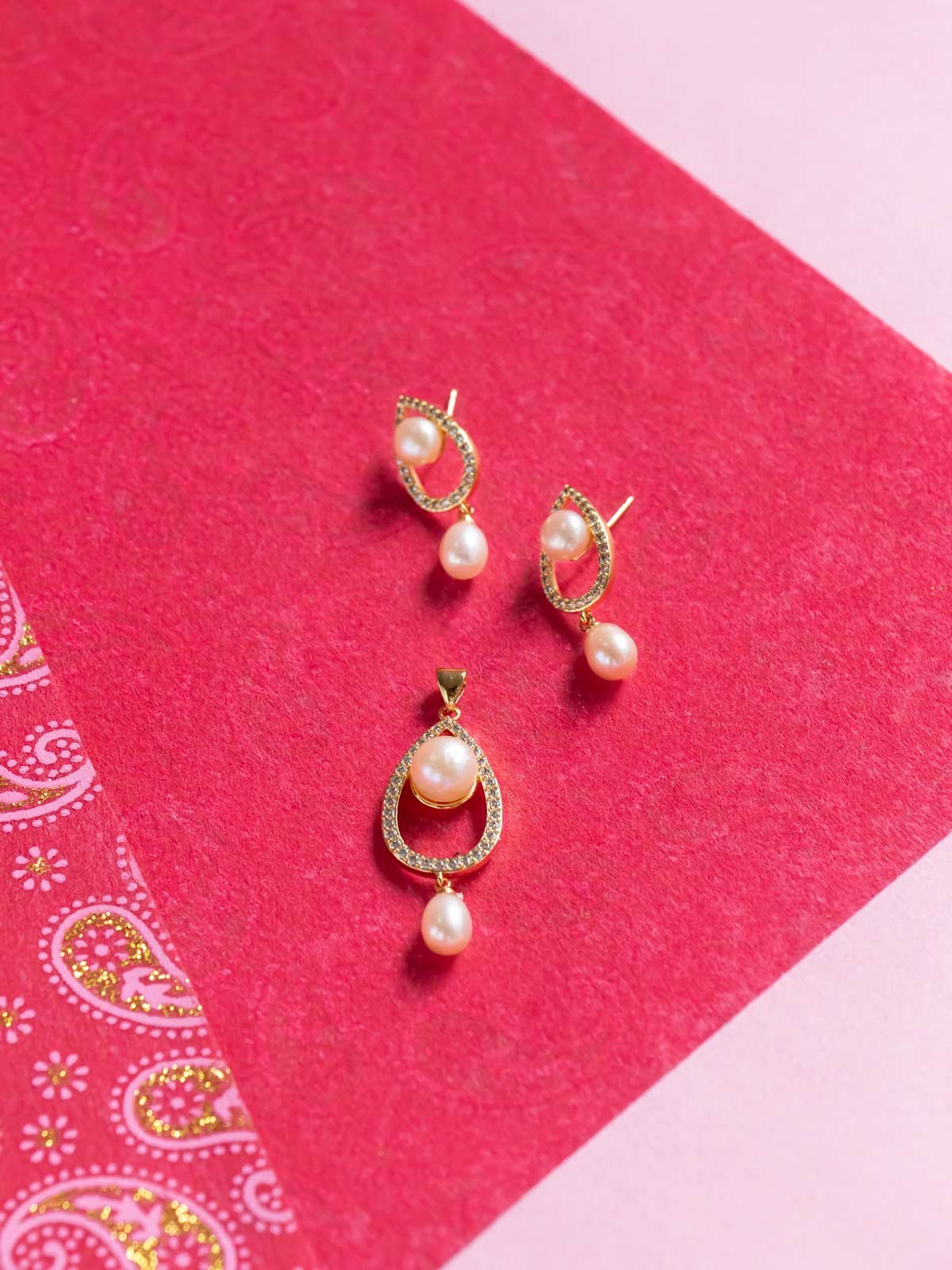 Shimmering freshwater pearl set in golden polish adorned with brilliant American diamonds. Offers a timeless appeal with a regal touch.