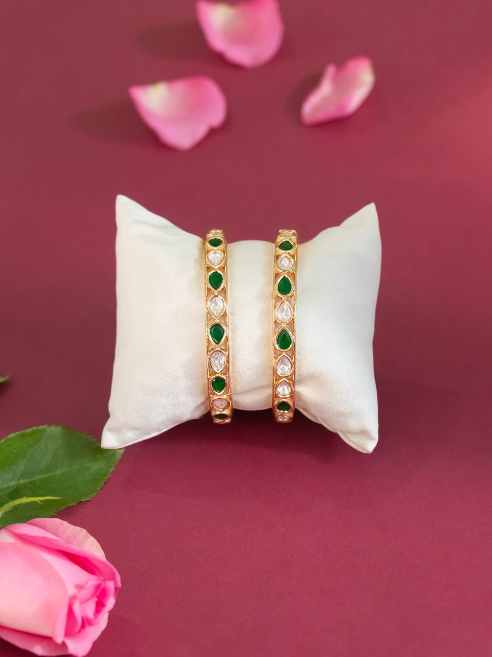 Exquisite Kundan bangles featuring an opulent design. Embellished with striking drop-shaped green semi-precious gems.