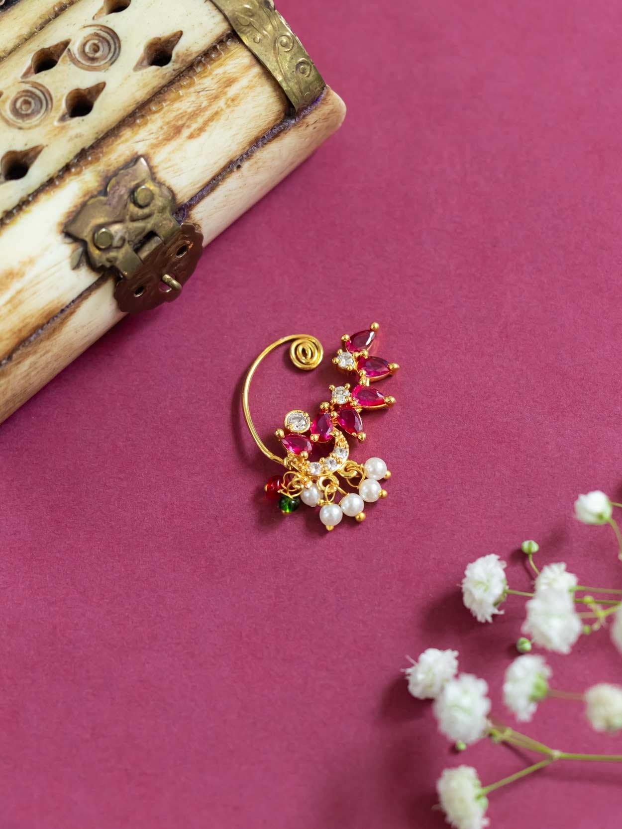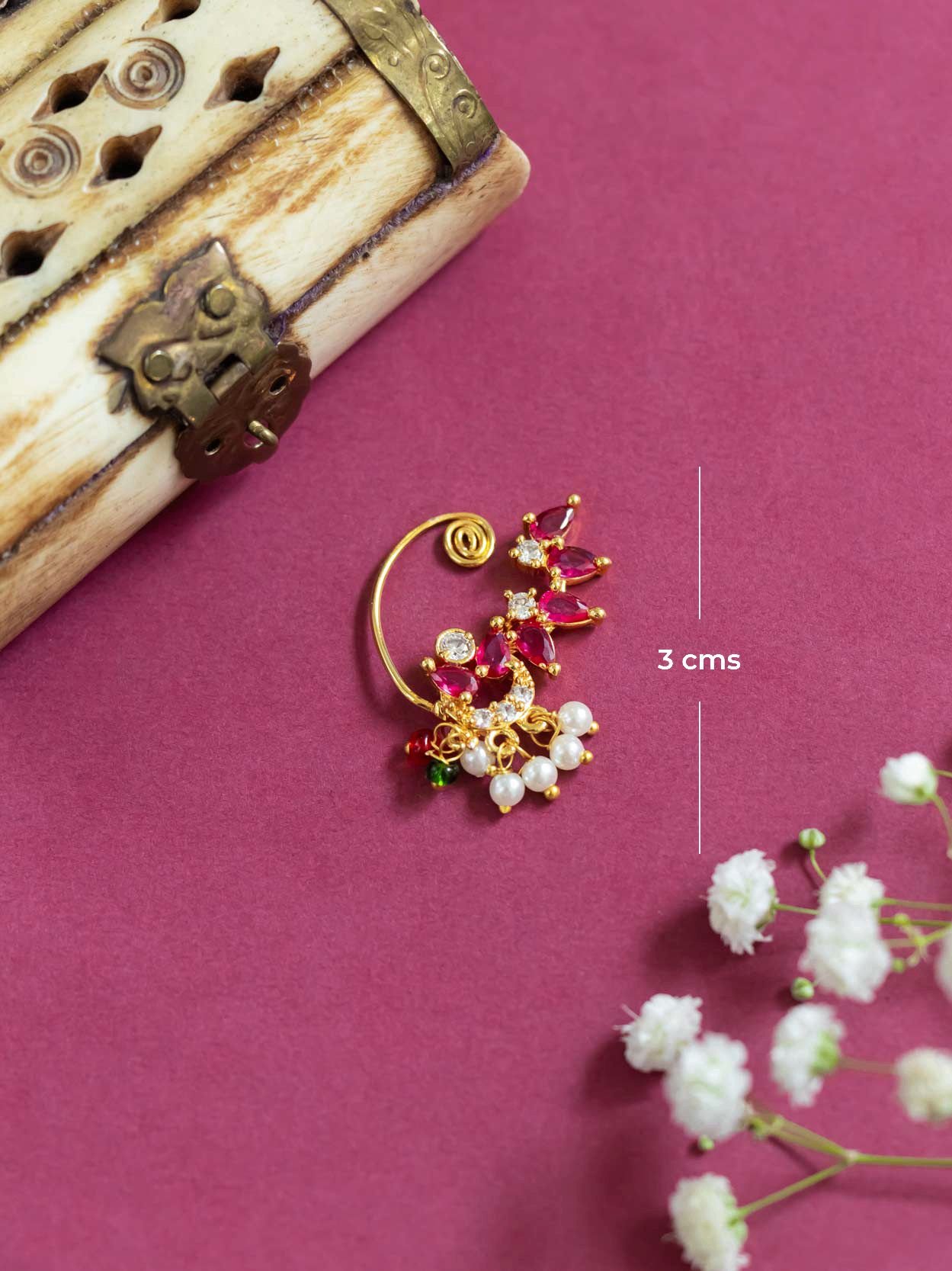 Classic 3 cm press-type Nath featuring delicate semi-cultured pearls. Provides a beautiful ethnic accent.