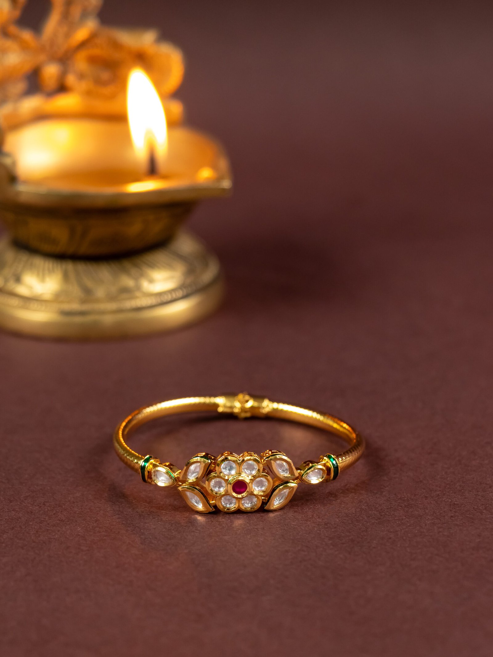 Exquisite Kundan openable bracelet with red semi-precious gems and floral/leaf shaped designs.