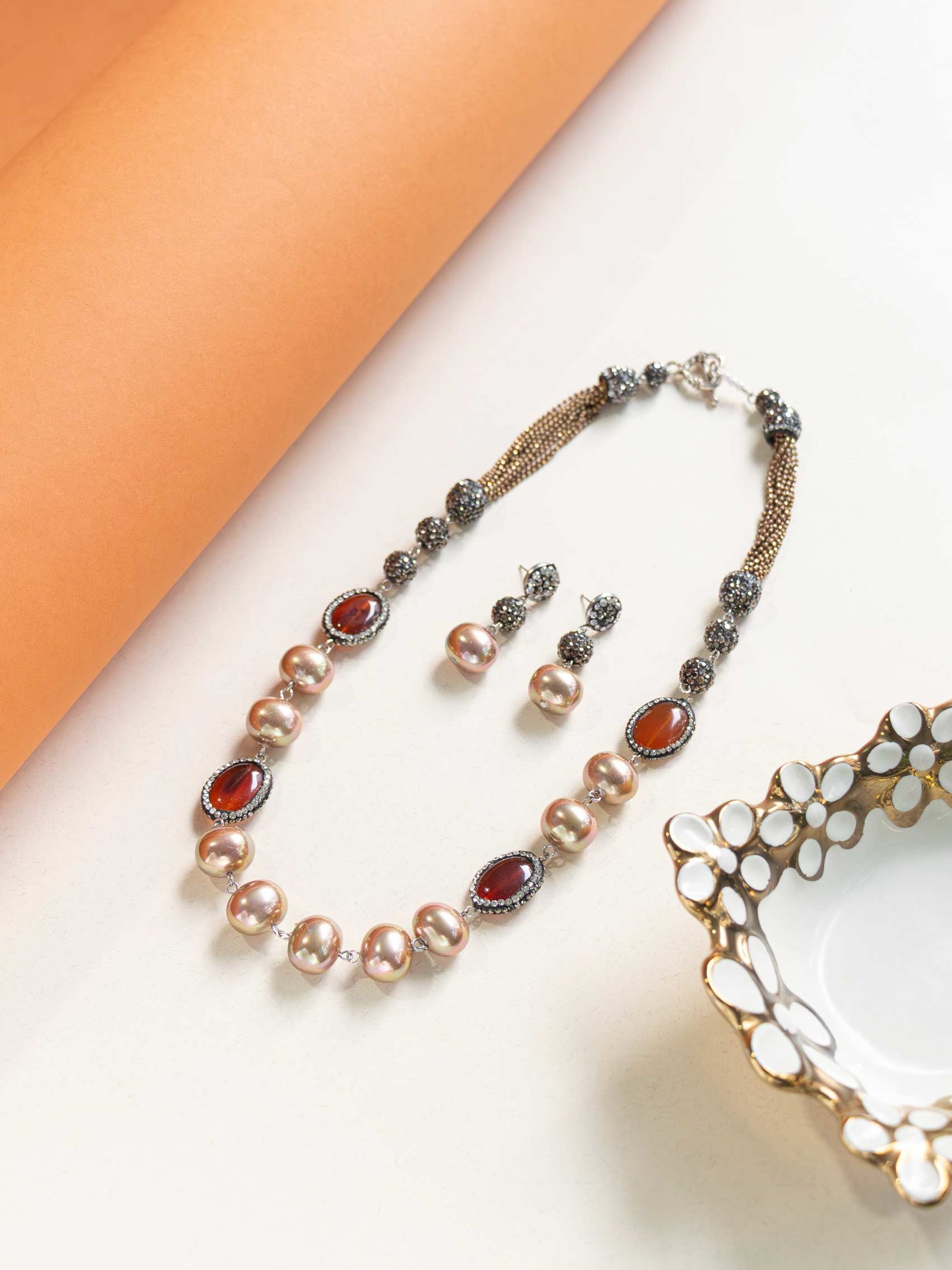 Shimmering beads mala necklace set featuring American diamonds and polished beads. A perfect accessory for adding a touch of glamour to your outfit.