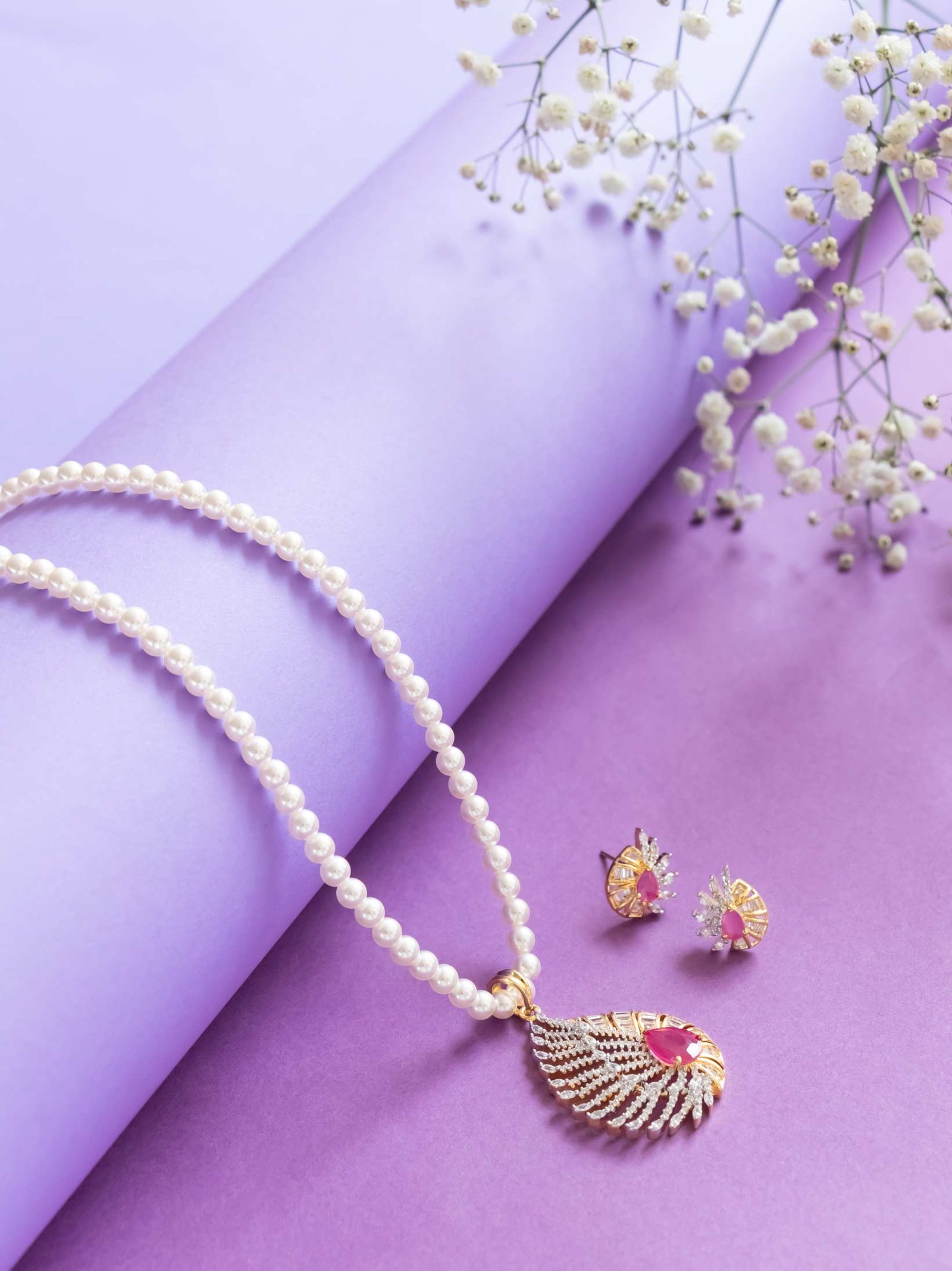 Charming 15-inch pearl necklace set featuring a floral-shaped pendant. Accented with lovely pink American diamonds for a soft, feminine glow.