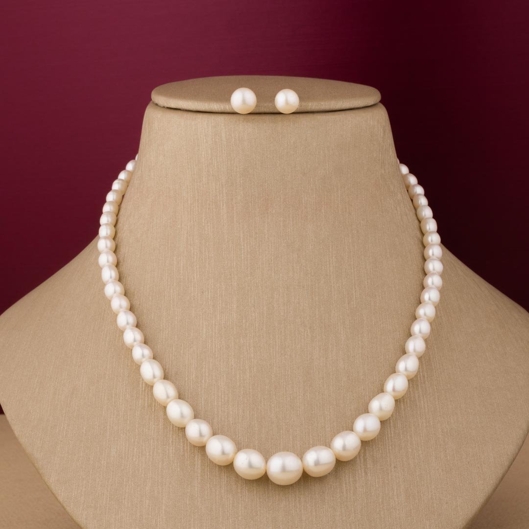 Freshwater Rice Pearl tapering mala with pearl studs. Mala is secured with a regular standard necklace hook.