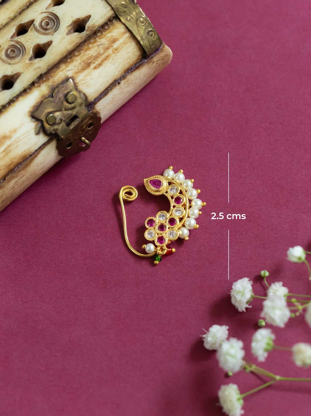 Elegant 2.5 cm press-type Nath with a floral shape and semi-cultured pearls. Features shimmering American diamonds.