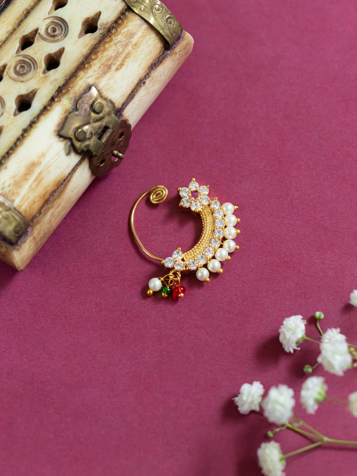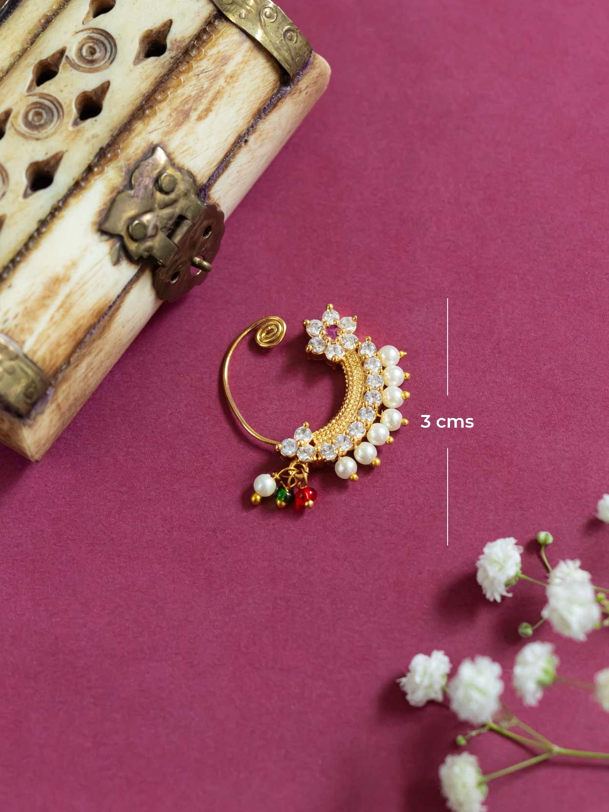 Elegant 3 cm press-type Nath with a charming floral shape and semi-cultured pearls. A beautifully detailed traditional piece.