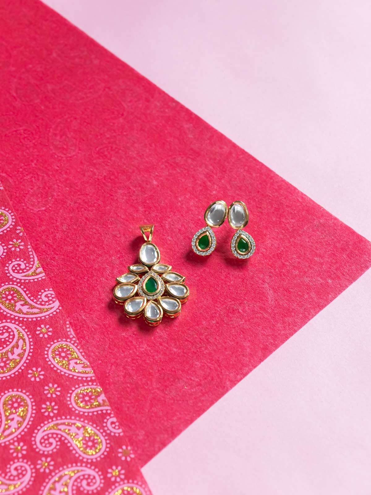 Sophisticated drop-shaped Kundan set with green semi-precious gems. Encircled by American diamonds for a luxurious, multi-layered sparkle.