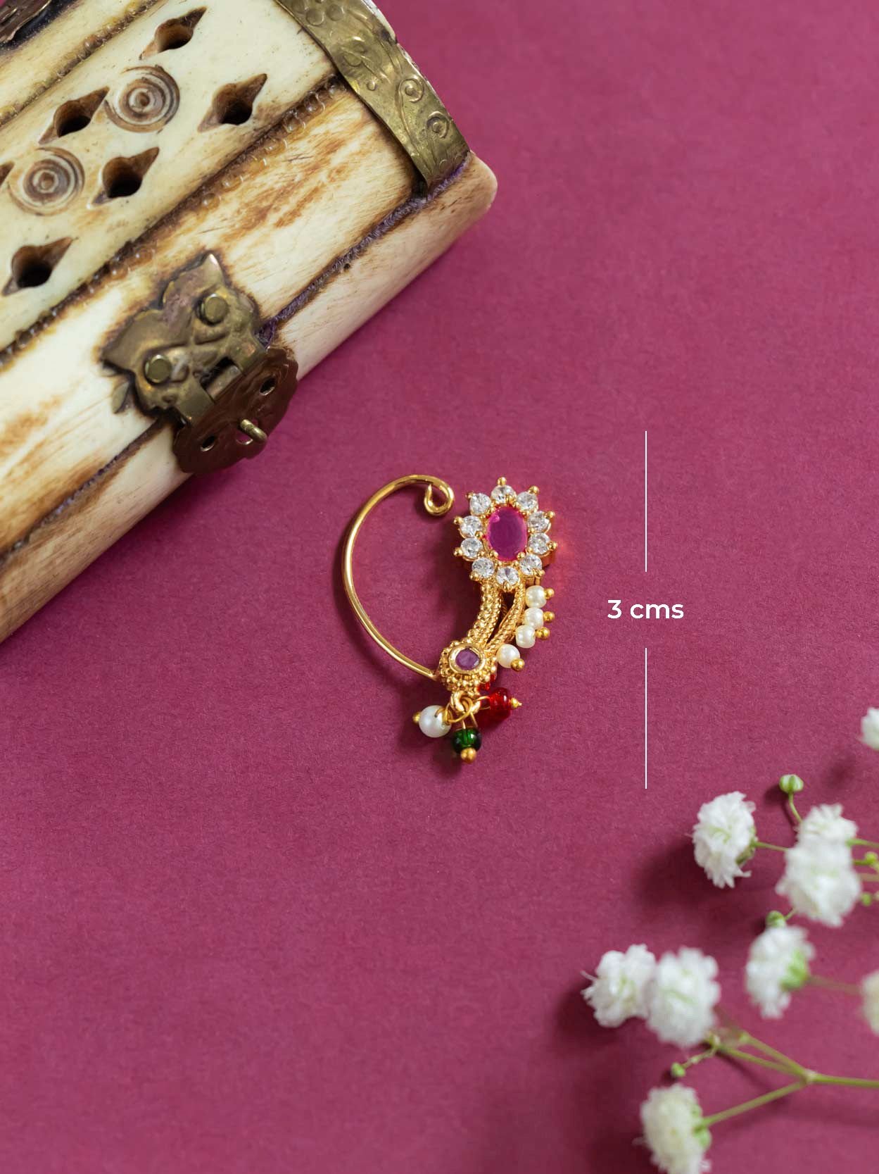 Sparkling 3 cm press-type Nath fully adorned with brilliant American diamonds. Offers a grand, traditional appeal.