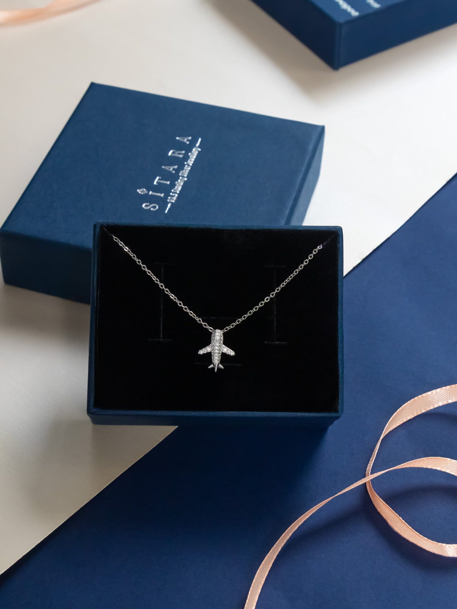 An adventurous 92.5 sterling silver chain with a unique American diamond and airplane-designed pendant.