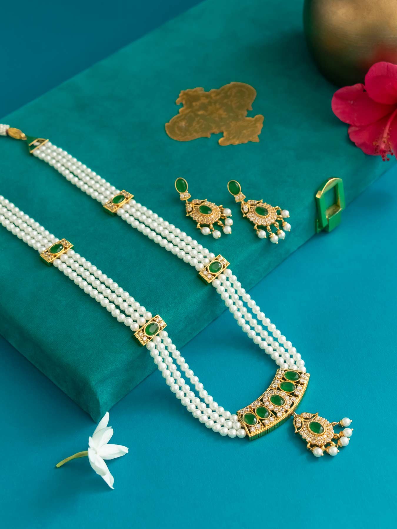 Dazzling semi-cultured pearl set with American diamonds and round green semi-precious gems. 20-inch, customisable.