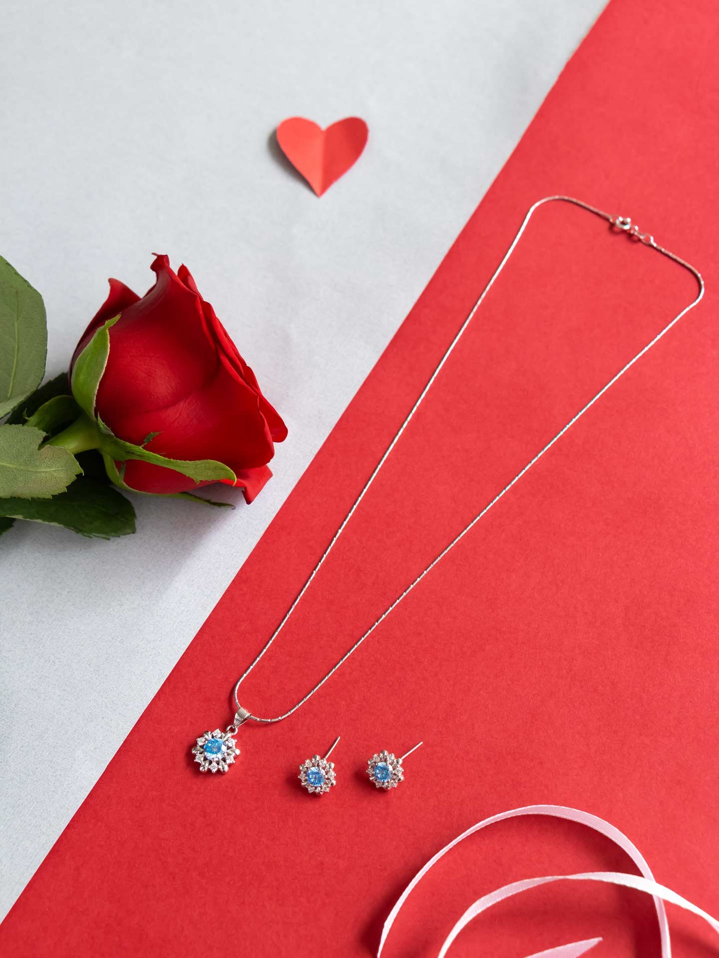 Stunning 92.5 Sterling Silver pendant set adorned with American diamonds and deep blue semi-precious gems. Offers a sophisticated, royal aesthetic for special occasions.