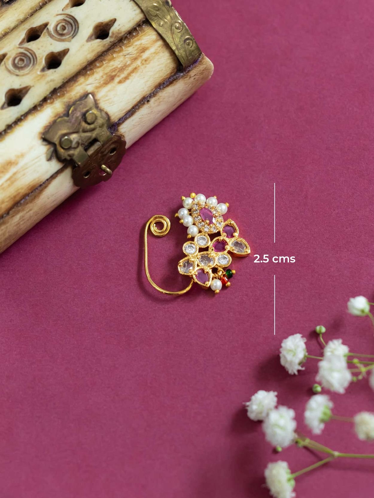Beautiful 2.5 cm Nath featuring semi-cultured pearls and delicate semi-precious gems. A subtle and charming accessory.
