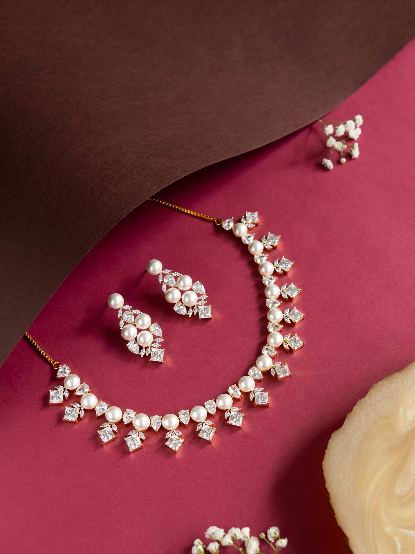 Delicate leaf-inspired necklace set crafted with shimmering American diamonds and pearls. A refined, nature-themed accessory perfect for adding grace to your special celebrations.