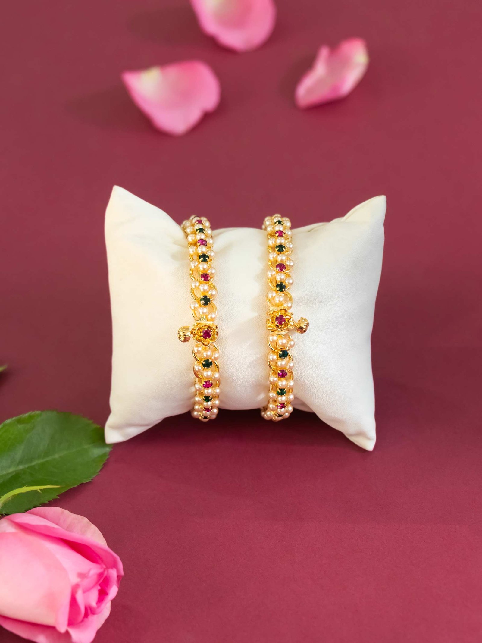 Gorgeous openable bangles intricately set with American diamonds, shell pearls, and vibrant red and green semi-precious gems. Perfect for festive wear.