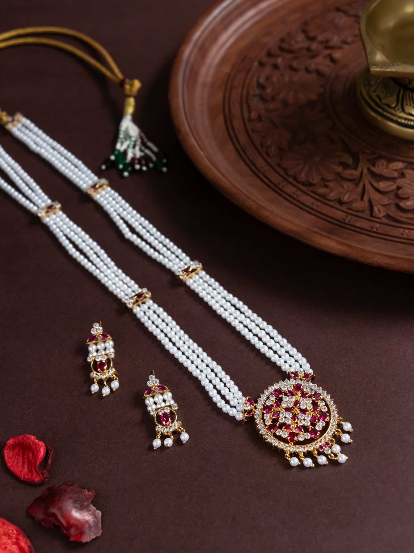Gorgeous semi-cultured pearls set with red and white semi-precious gems. 20-inch, customisable length.