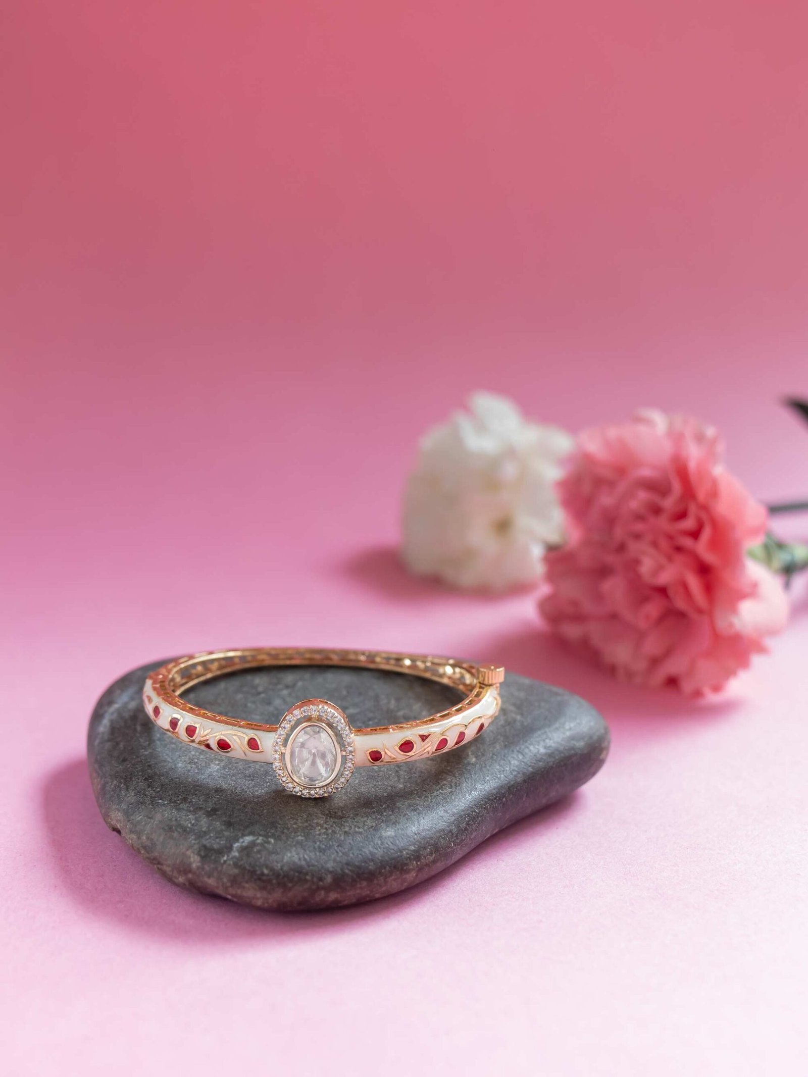 Ornate openable bracelet with a round Kundan stone surrounded by American diamonds. Detailed with traditional Meenakari work for a royal finish.