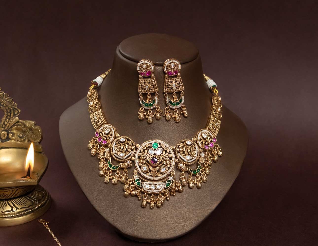 Luxurious antique necklace set featuring round, floral, and leaf-shaped traditional designs.